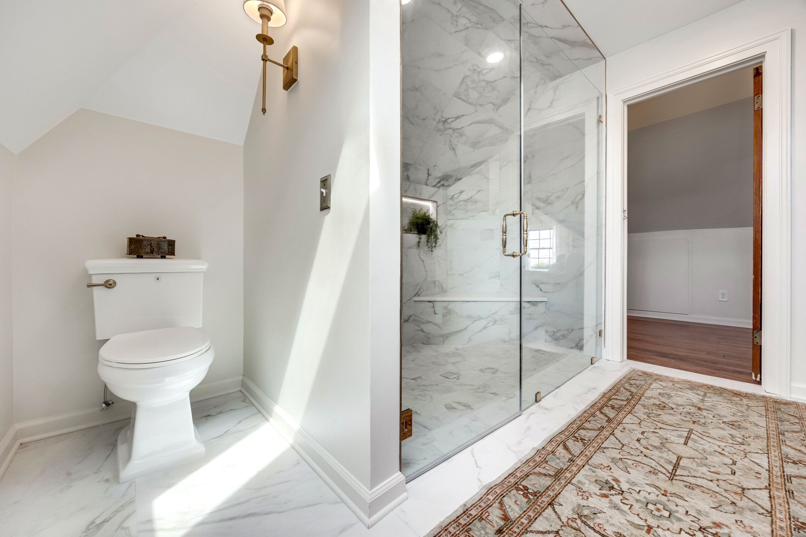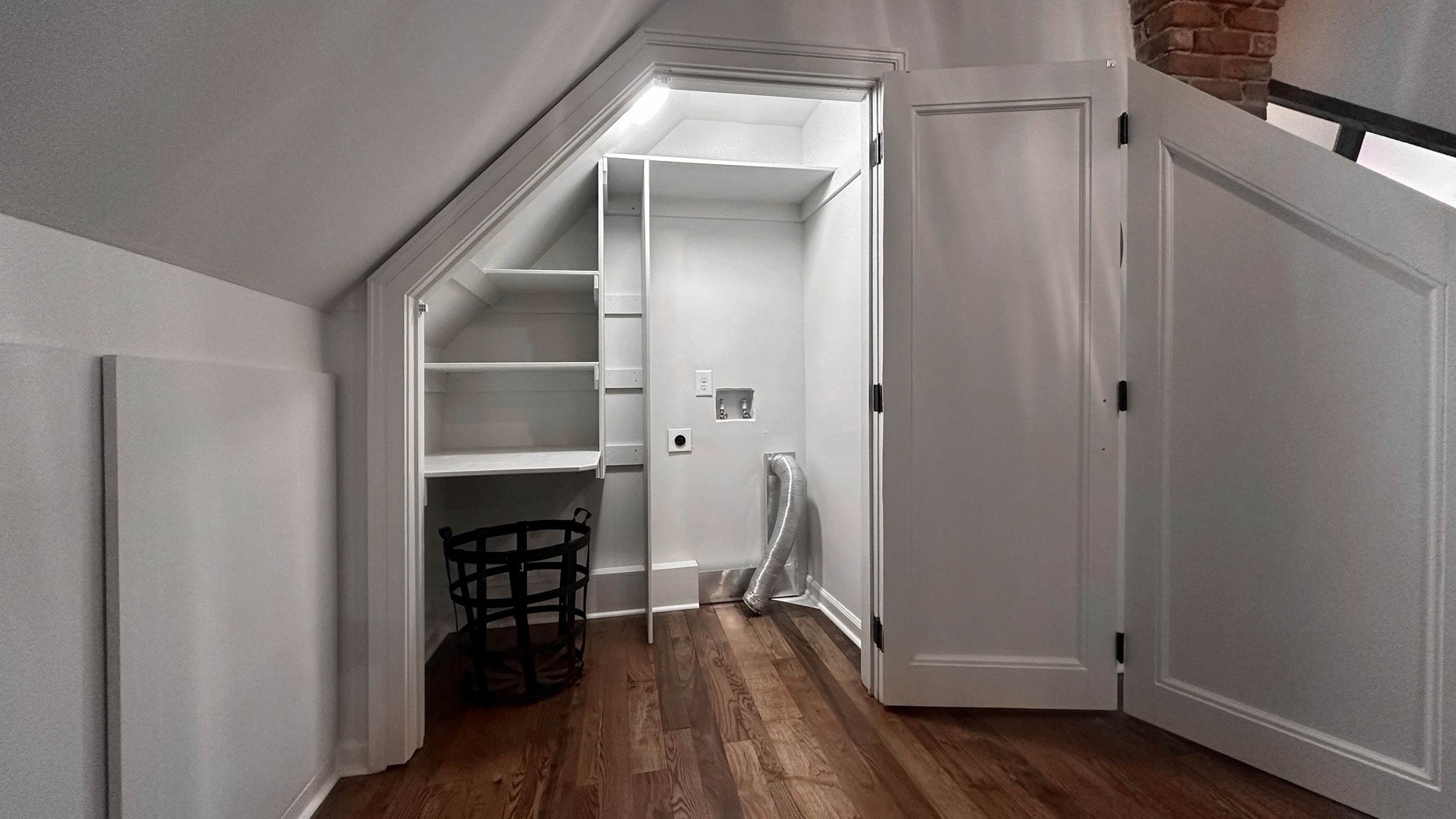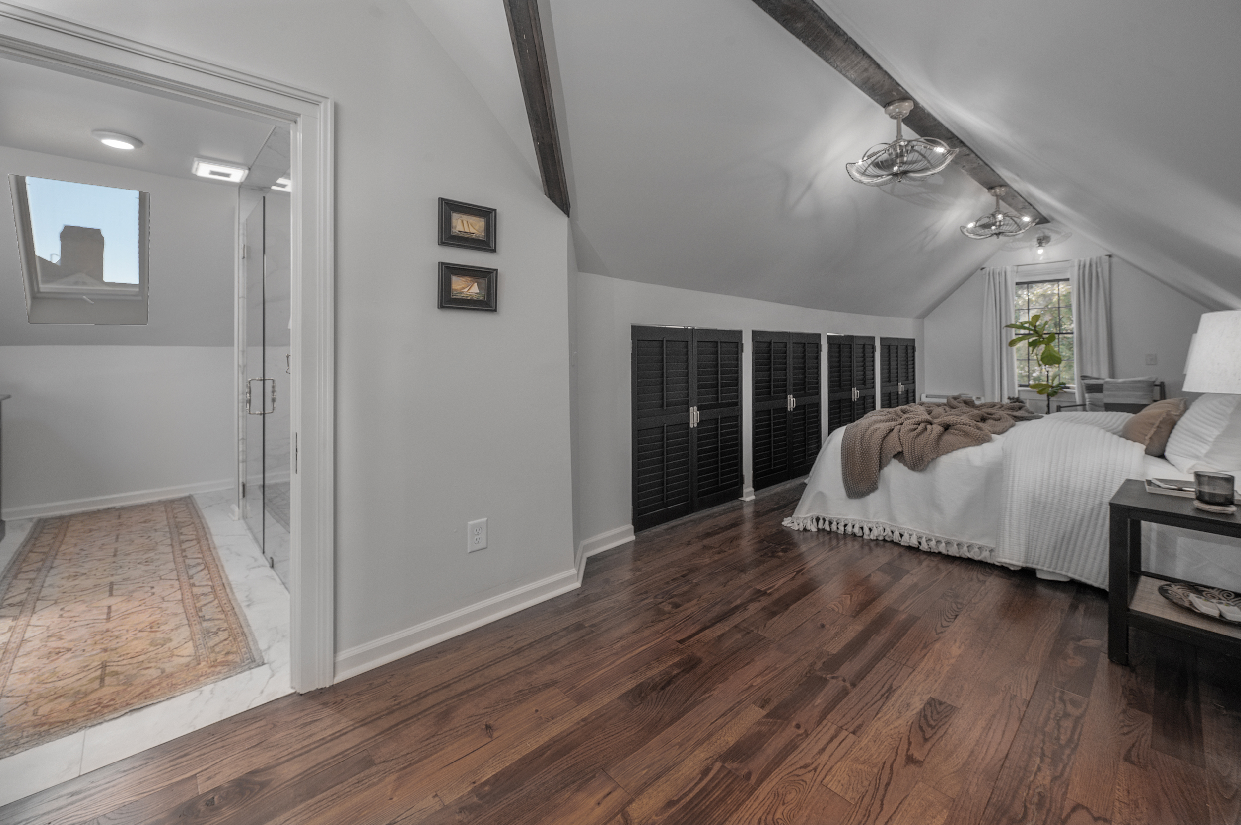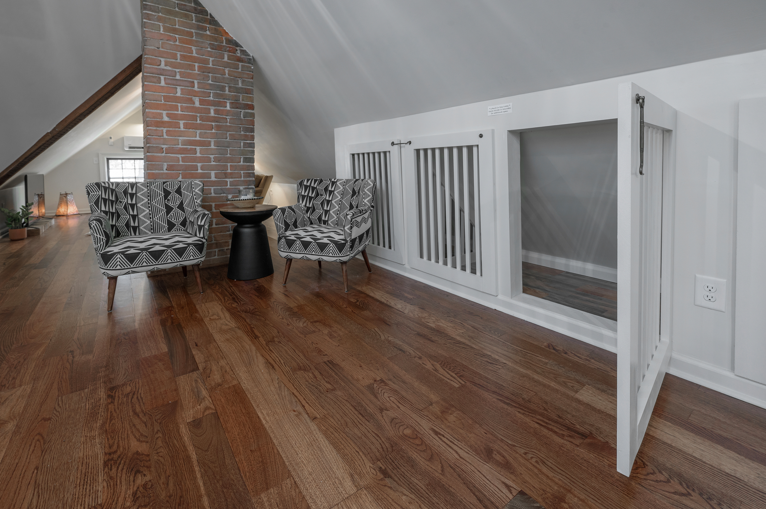 • Completion of the second level primary suite, which includes a bedroom, bathroom, laundry room, custom built-in dog crates, closet and knee-wall storage, and multiple sittng areas