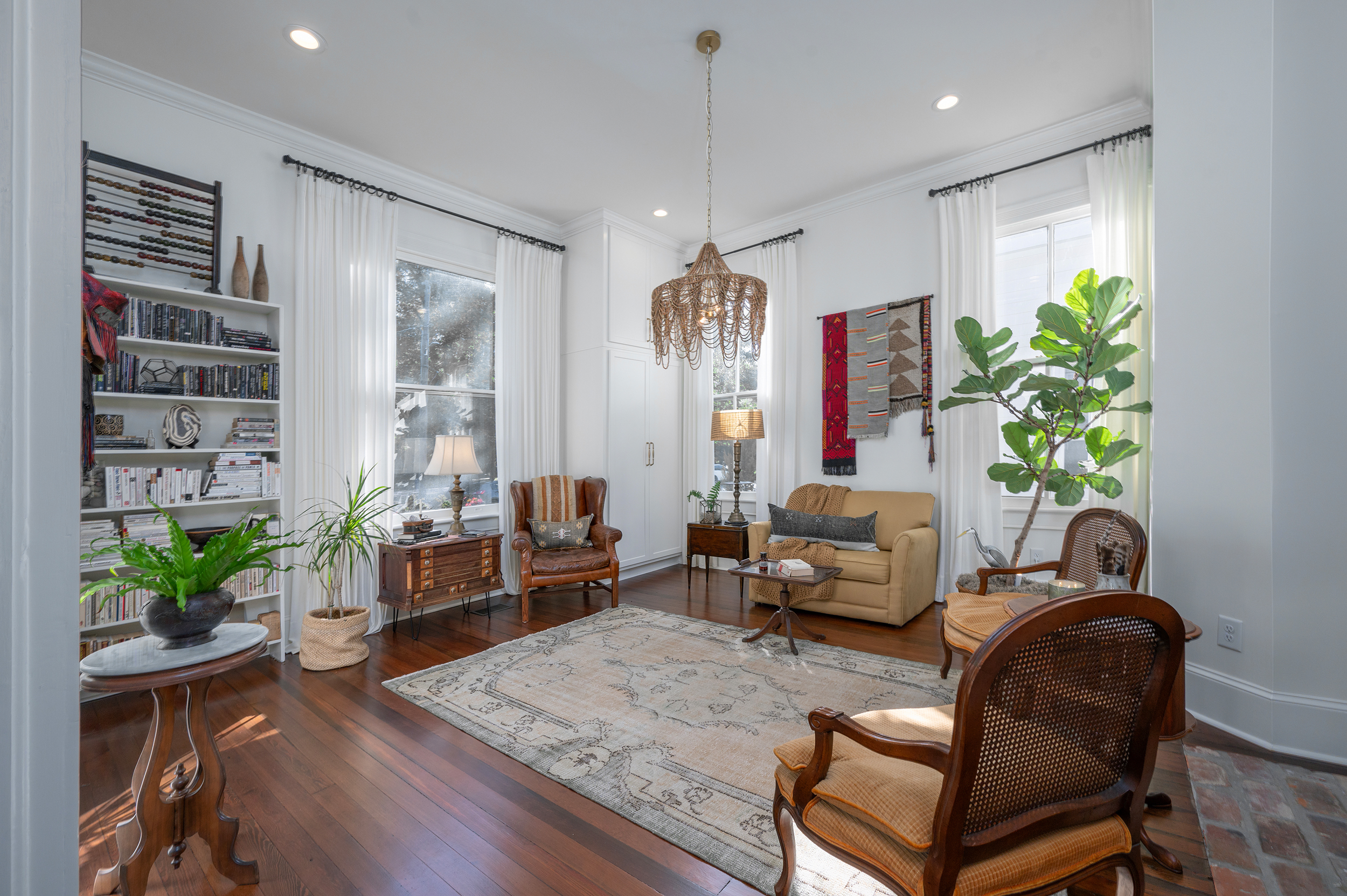 • The front room is considered 1 of the 3 bedrooms and has plenty of closet storage, but could also easily be used as a library, study or additional living area. The current owner’s used it as a library, with a pull out sofa for guests (the small gold settee in the room is actually a pull out bed!)