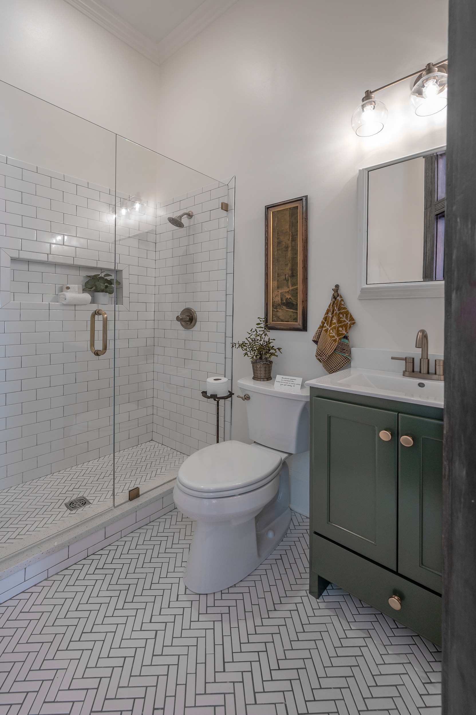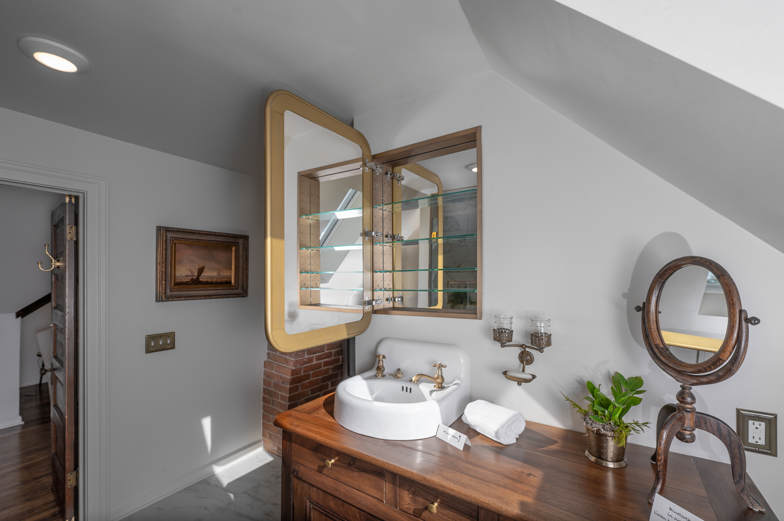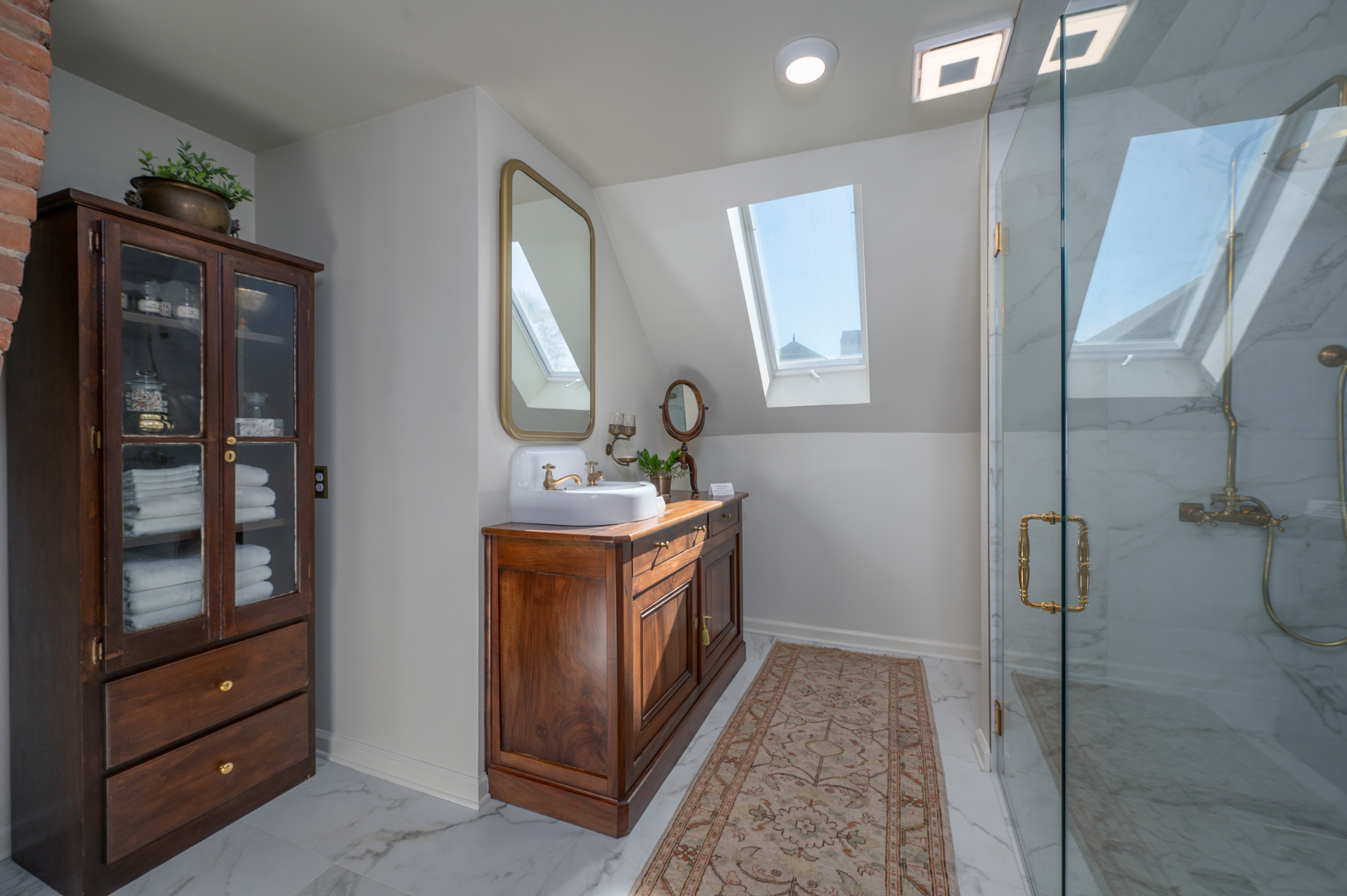 • Bathroom features to note: bluetooth speaker, medicine cabinet, skylight that opens for fresh air, lighting in shower, unlacquered brass that will age beautifully