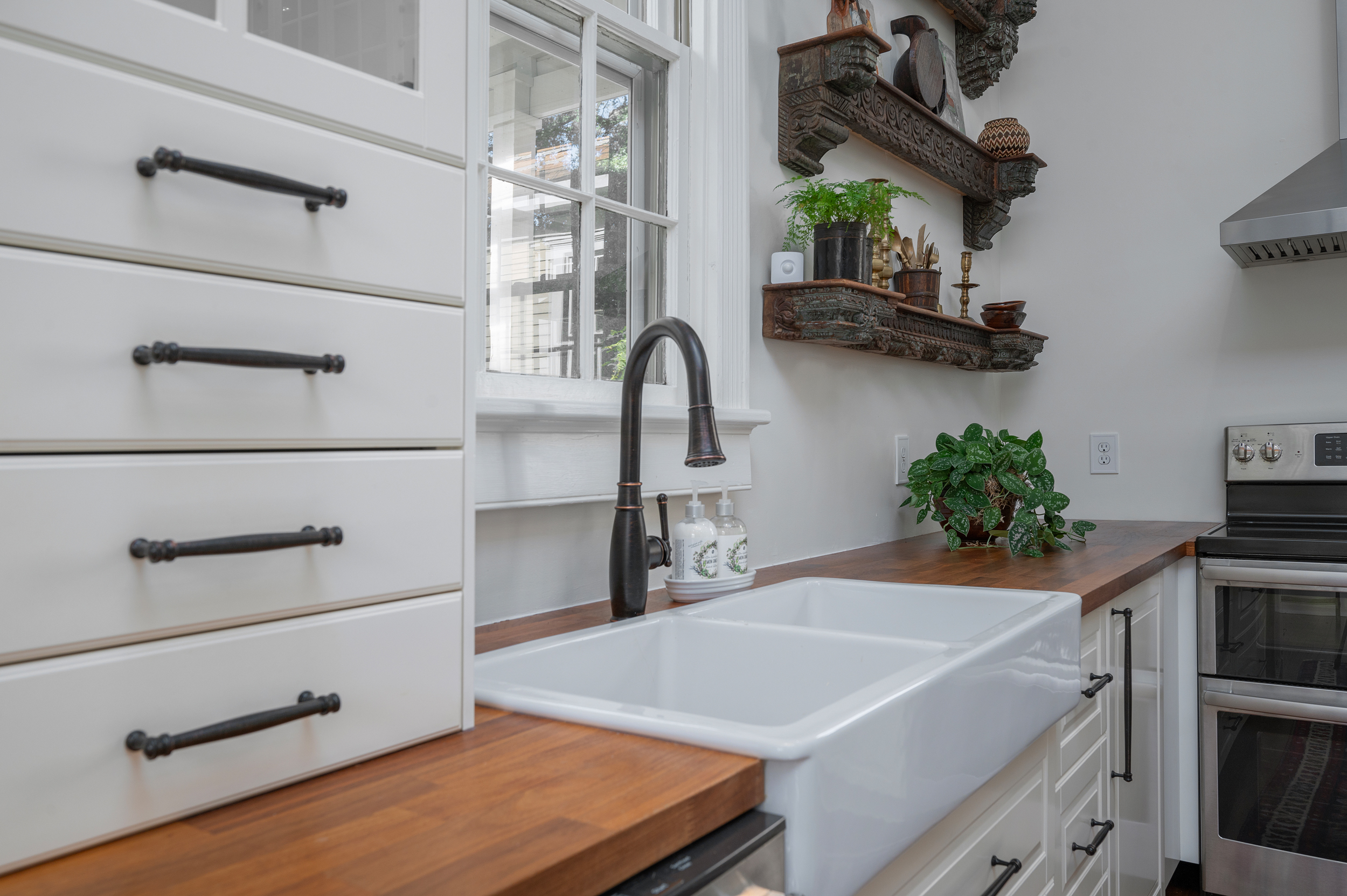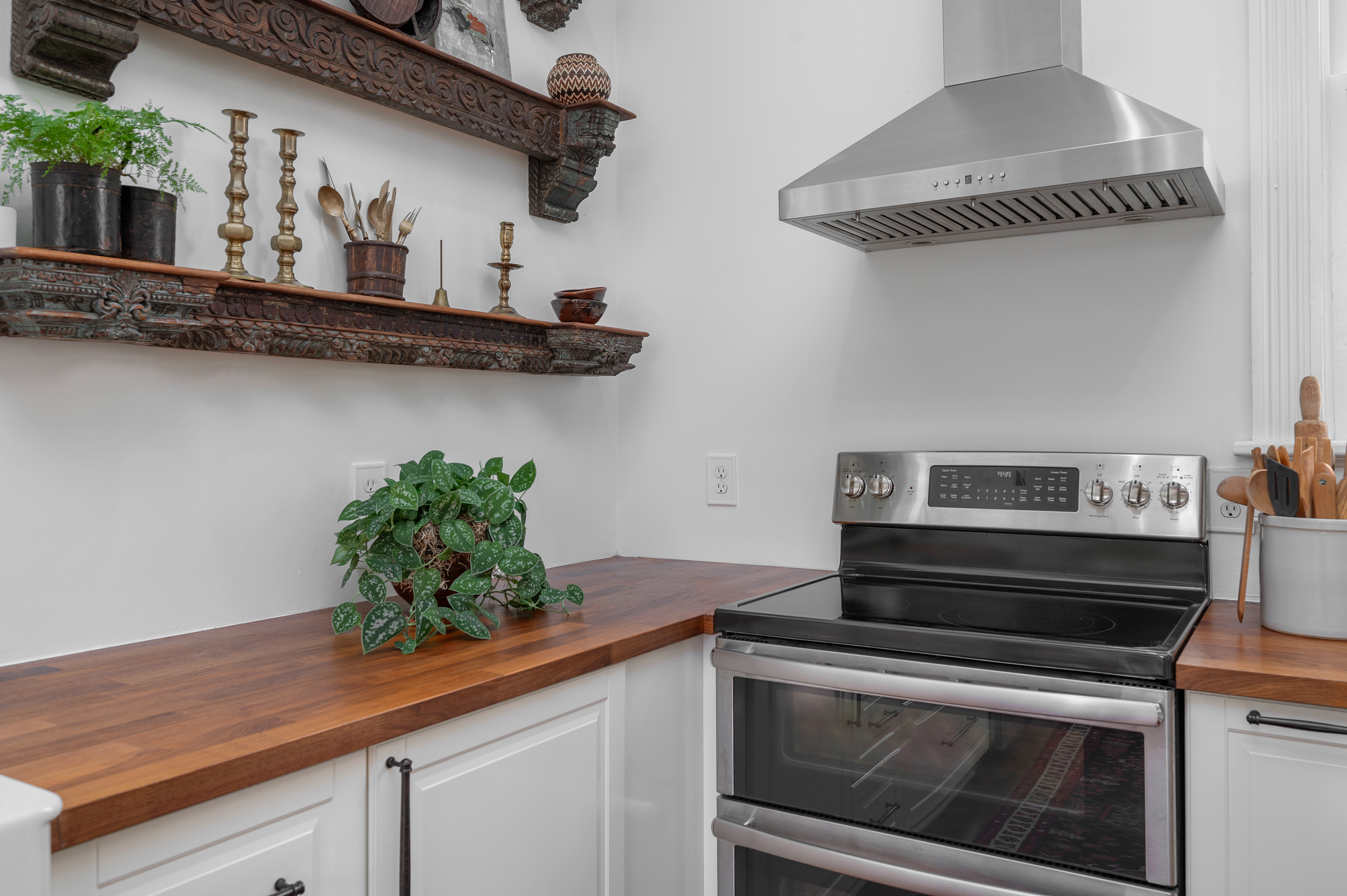 • Many of the upper cabinets on the north wall have interior pull drawers + adjustable shelving