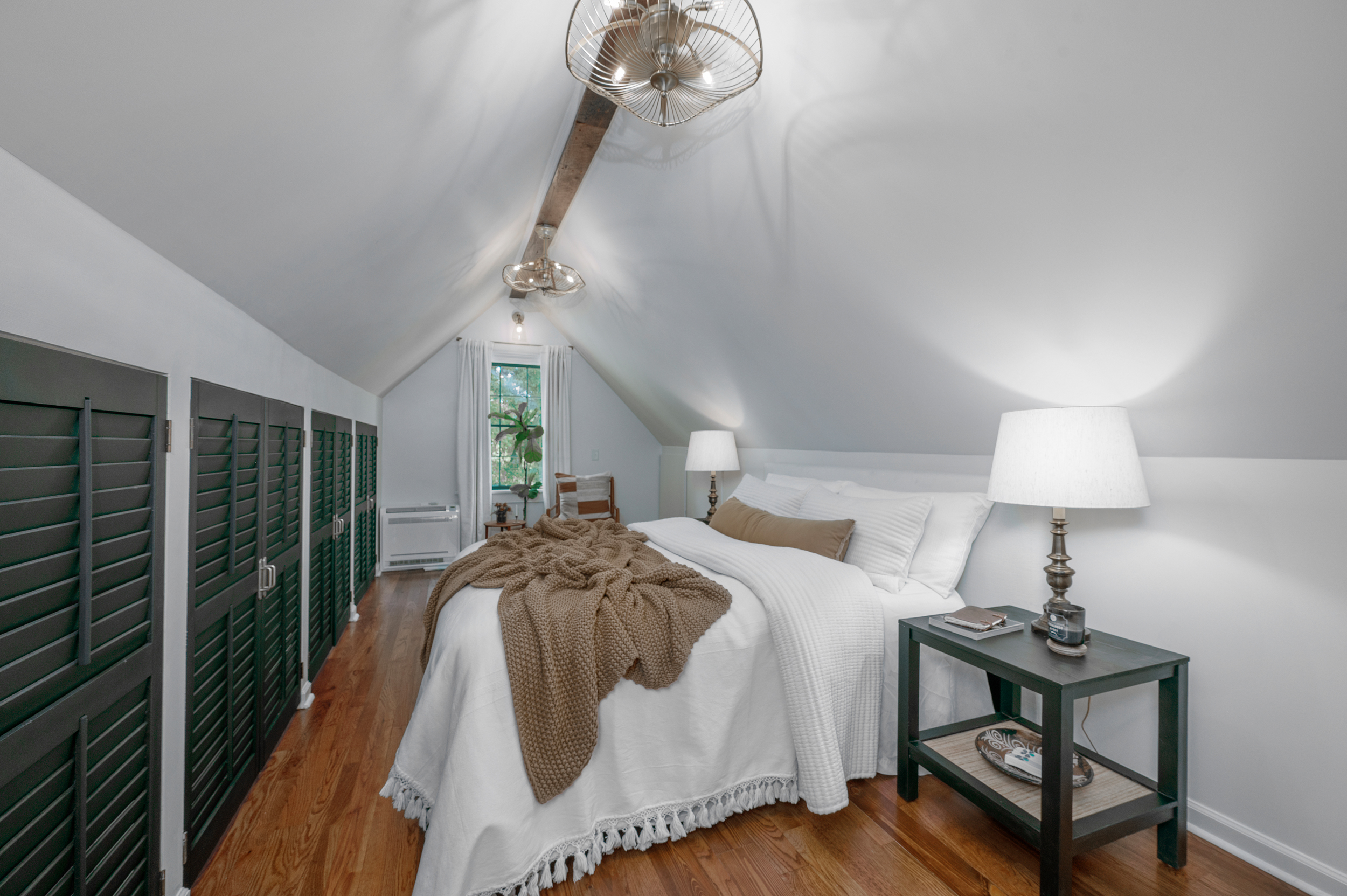 • Bedroom features to note: ample storage between closet and knee wall built-ins, stylish hidden ceiling fans
