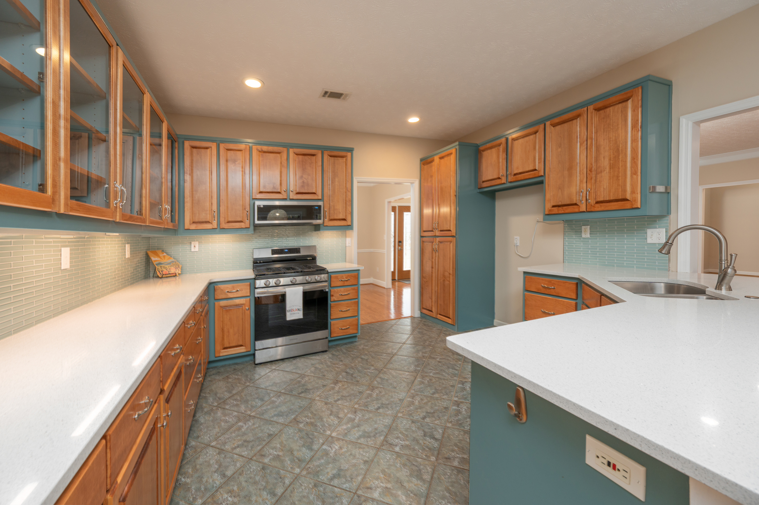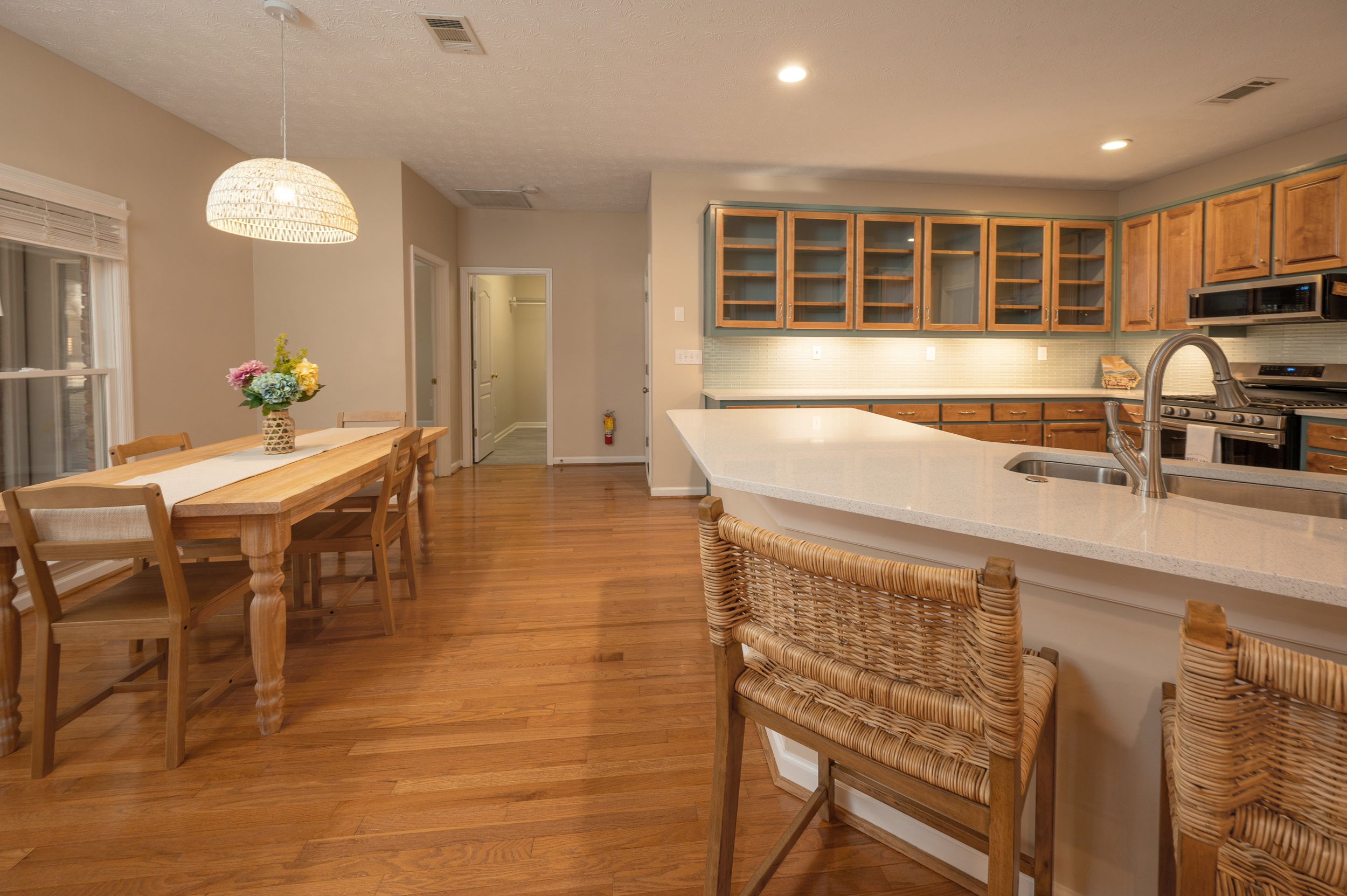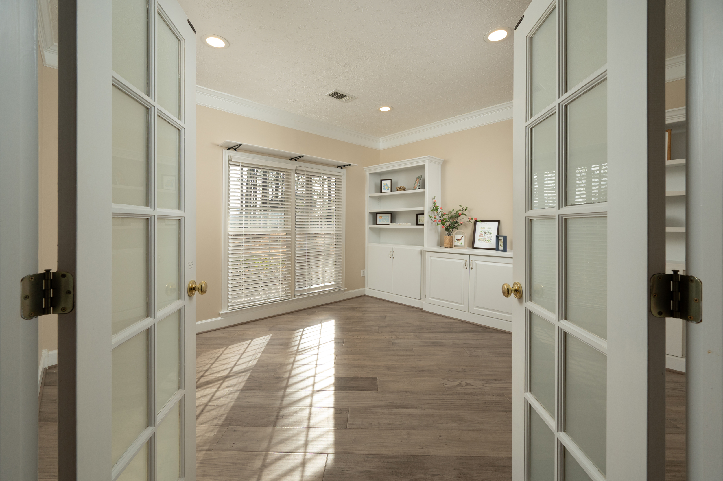 The kitchen blends function and style with quartz countertops, a glass tile backsplash, gas stove and stainless-steel appliances, opening seamlessly to the dining room or flex space—perfect for formal meals, casual entertaining, or reimagining as your lifestyle evolves. A dedicated office or bonus room with custom built-ins provides the ideal work-from-home setup or creative retreat.