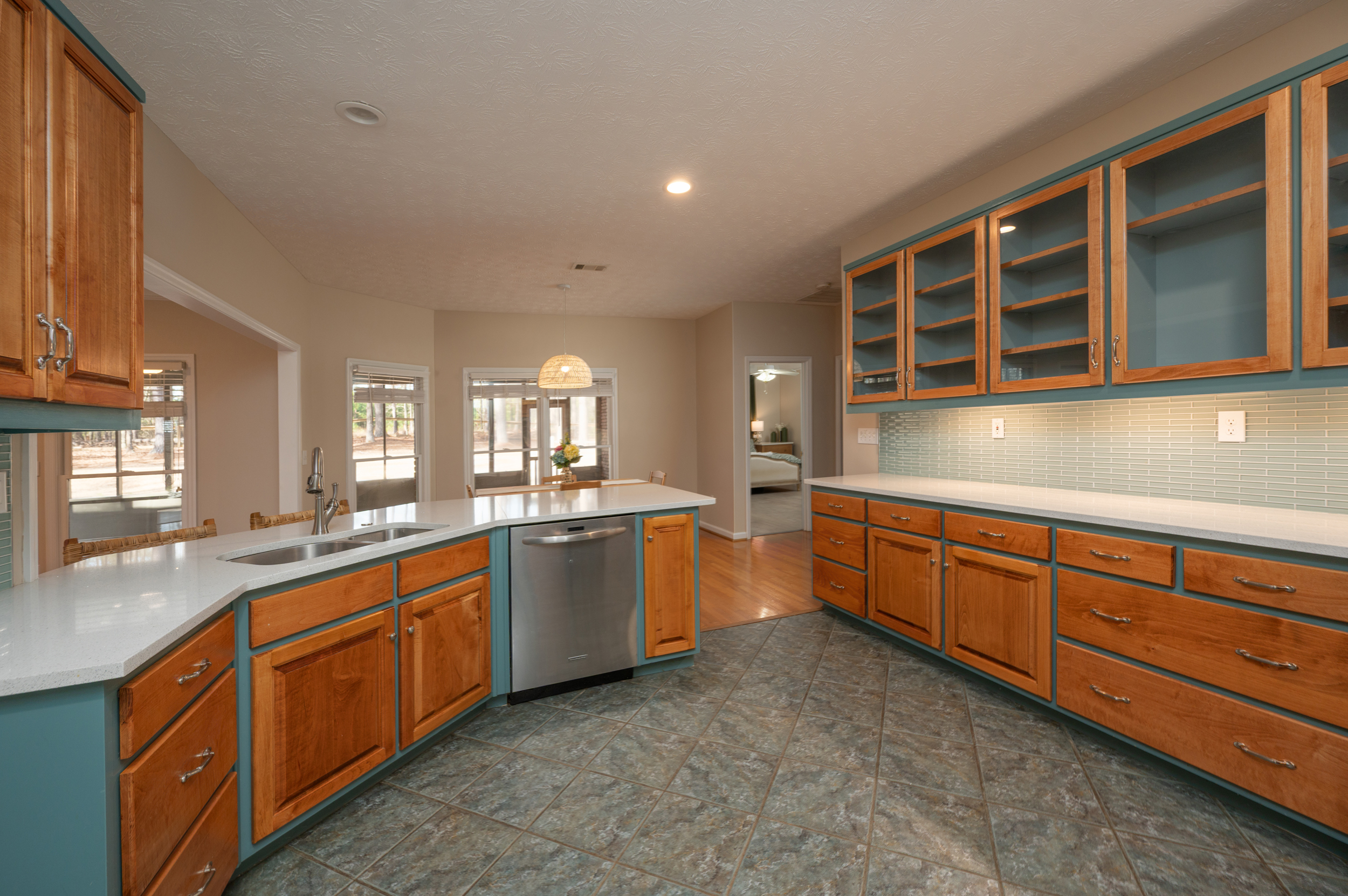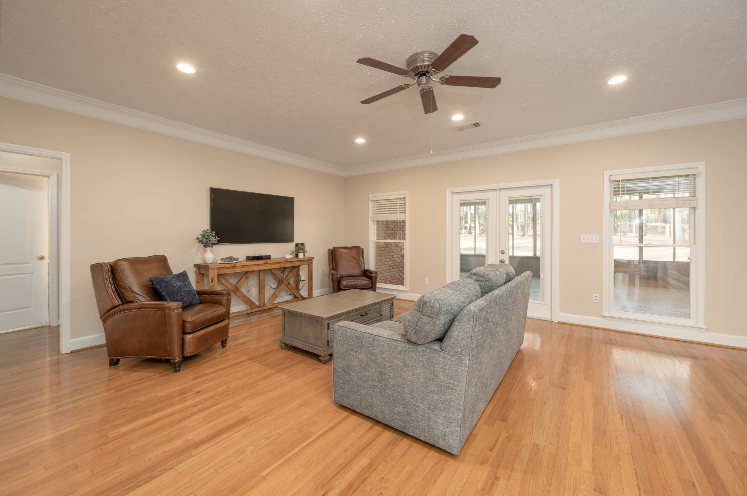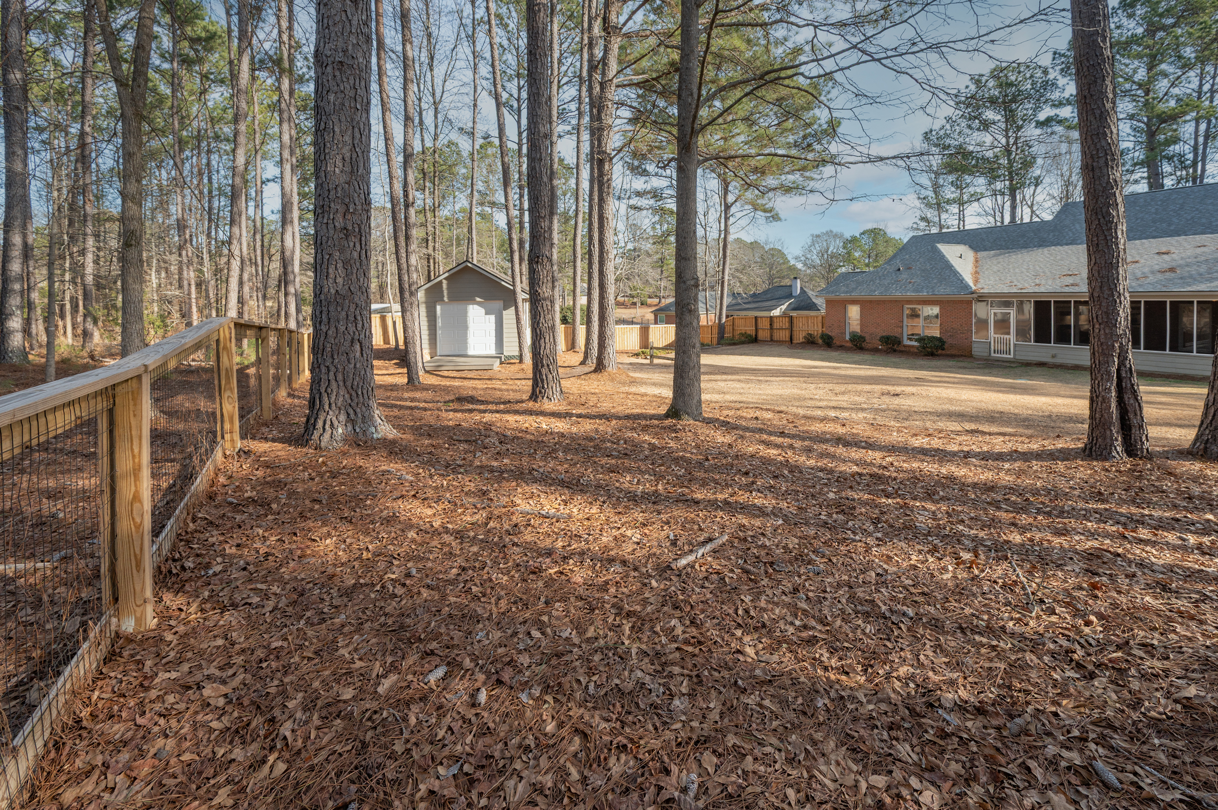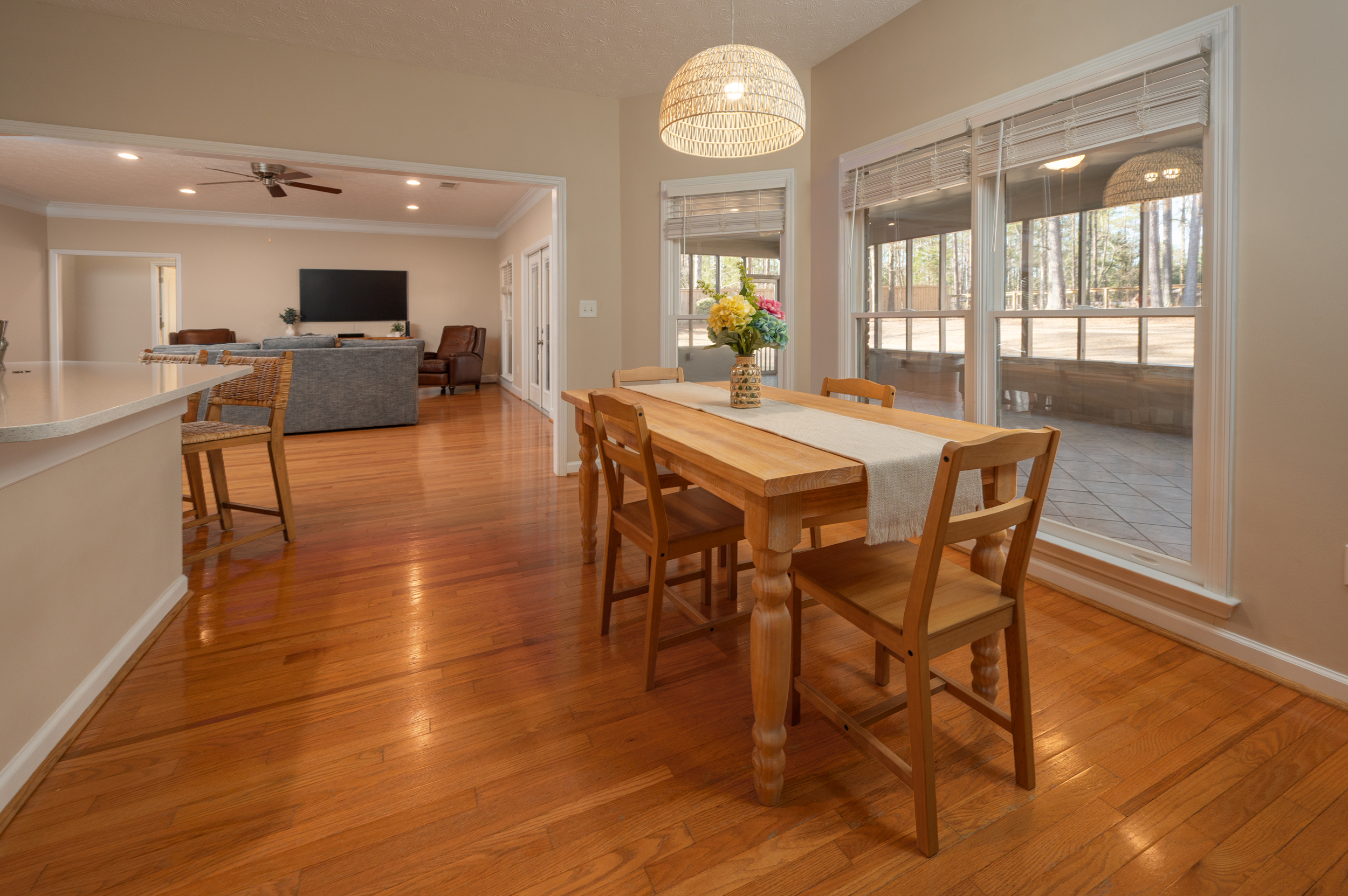 Tucked privately on one side of the home, the primary suite feels like its own sanctuary. Newly renovated, the ensuite bath brings a fresh, spa-like feel, while private access to the expansive screened porch creates a daily connection to the outdoors. This porch—approximately 550 square feet—overlooks the fenced backyard and becomes an extension of the living space, equally suited for morning coffee, evening conversations, or quiet moments at the end of the day.